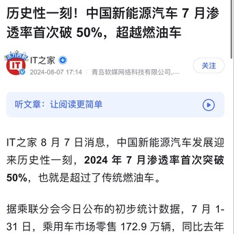 【新能源汽车7月整月渗透率破50%】今年四月份已有两周短暂破5,如今历史性的整月渗透率破5,达到50.2%,正式超过燃油车。这说明汽车的新能源电动化已经成为不可逆转的趋势。刚看到这个消息还真是恍如隔世,四年前买个新能源车各种被嘲笑。